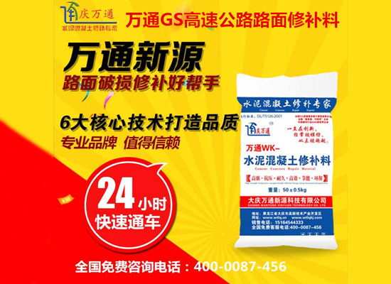大慶萬(wàn)通新源科技有限公司獨(dú)有的混凝土路面高強(qiáng)速補(bǔ)料,是水泥混凝土路面病害修復(fù)的好材料。疲勞、凍融循環(huán)、彎曲壓力、滲水和基層破壞等原因都會(huì)引起水泥路面的破損,從而帶來(lái)高昂的維護(hù)費(fèi)用。與以往的剛性修補(bǔ)方法不同,混凝土水泥路面維修速補(bǔ)膠提供了一種獨(dú)特的柔性修補(bǔ)產(chǎn)品和技術(shù),高柔性、高抗拉性,可跨伸縮縫施工和高抗壓性使得混凝土快補(bǔ)產(chǎn)品為水泥混凝土路面提供了******性的修補(bǔ)。傳統(tǒng)的剛性修補(bǔ)方案,如環(huán)氧砂漿和快干水泥產(chǎn)品,由于其自身的粘結(jié)失效,抗疲勞性低以及與原路面不同的伸縮系數(shù),修補(bǔ)面會(huì)在短時(shí)間內(nèi)失效或產(chǎn)生新的裂縫,需要反復(fù)修補(bǔ),有效期短且費(fèi)用高昂。大慶萬(wàn)通新源科技有限公司的混凝土水泥路面維修速補(bǔ)膠可以隨原路面一起伸縮,移動(dòng),從而避免了粘結(jié)失效和產(chǎn)生新裂縫。萬(wàn)通快補(bǔ)產(chǎn)品優(yōu)異的粘結(jié)性、柔韌性和高防滑性,特別適用于水泥路面的淺層粘合修補(bǔ),多邊角混凝土板層修補(bǔ),跨伸縮縫修補(bǔ)以及路面沉陷修補(bǔ)。萬(wàn)通混凝土病害修補(bǔ)料針對(duì)混凝土起皮起沙、斷板裂縫、蜂窩麻面、坑槽露石子、漏筋掉皮、橋梁的掉皮漏筋快速通車(chē)使用時(shí)間長(zhǎng)。應(yīng)用萬(wàn)通快補(bǔ)產(chǎn)品,施工后一天就可以恢復(fù)交通。大慶萬(wàn)通新源科技有限公司的萬(wàn)通水泥路面維修速補(bǔ)膠適用于高速公路、機(jī)場(chǎng)路面、農(nóng)村村村通路面、廠坪、學(xué)校操場(chǎng)、市區(qū)公路、小區(qū)路面、橋梁、水泥路面的修補(bǔ)。使用萬(wàn)通特快補(bǔ)材料修補(bǔ)路面可以一勞永逸! 水泥地面起砂怎么辦,混凝土修補(bǔ)劑混凝土地面起砂,混凝土地面修補(bǔ),地面起砂怎么辦,